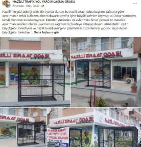 “Dört Yol gibi önemli bir bölgede yaşadığımız bu durum kabul edilemez. Ziraat Odası, apartmanın ortak alanını duvarla çevirip içine kafesler koydu. Bu müdahale sebebiyle alanımızı kullanamıyoruz ve güvenliğimiz tehdit altında. Defalarca uyarmamıza rağmen herhangi bir adım atılmadı. Sayın Aydın Büyükşehir Belediye Başkanı Özlem Çerçioğlu ve Nazilli Belediye Başkanı Ertuğrul Tetik’in bu durumu fark etmemesi düşündürücü. Bu uygulamanın derhal sonlandırılmasını istiyoruz.”