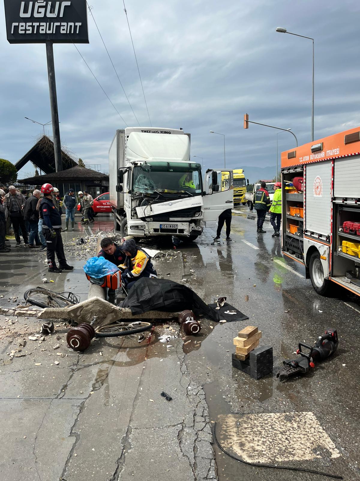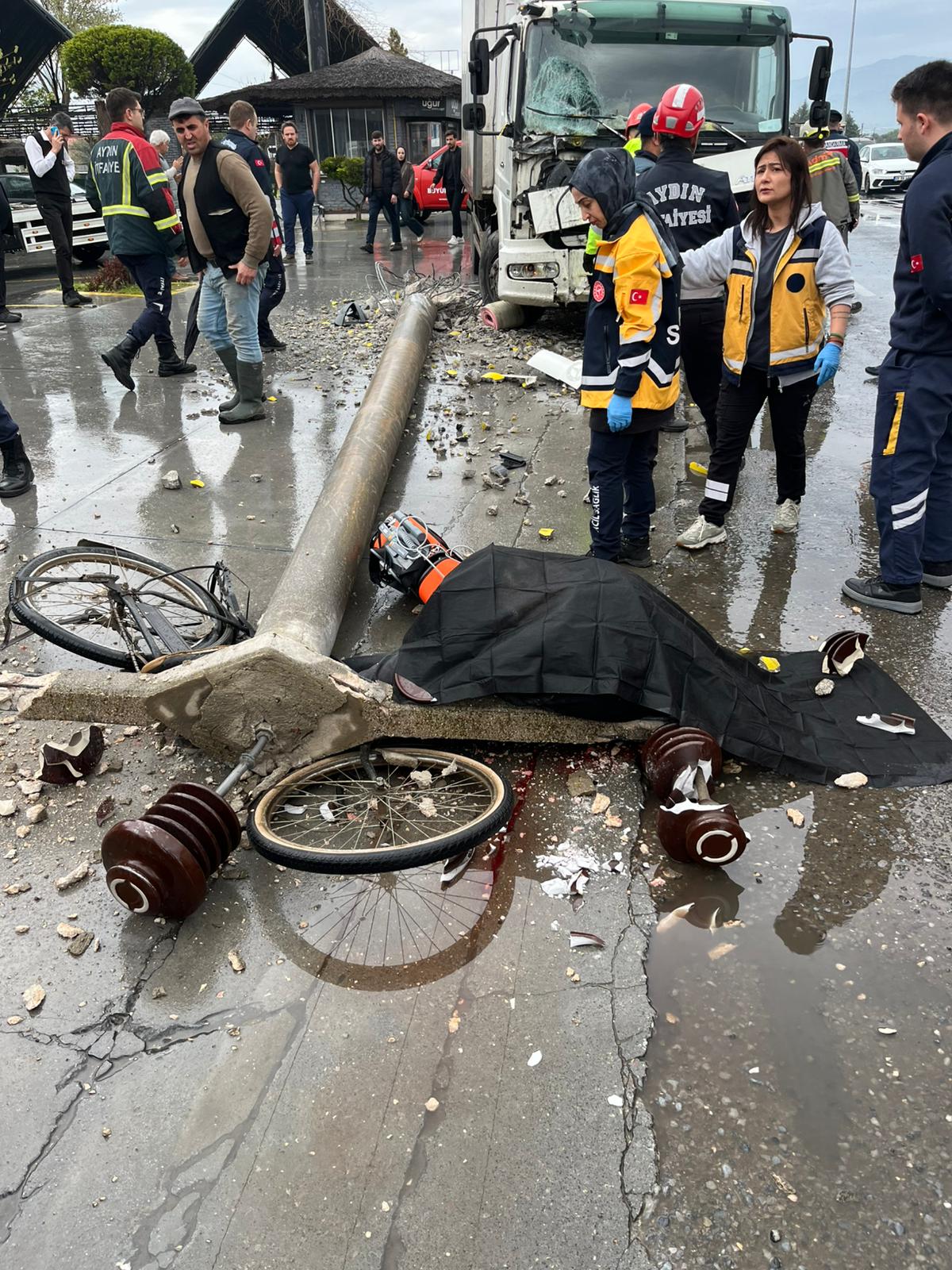 Işık ihlali sonrası kontrolden çıkan kamyon, büyük bir hızla yol kenarında bulunan beton elektrik direğine çarptı. Çarpmanın şiddetiyle kökünden sarsılan direk, büyük bir gürültüyle yola doğru devrildi.