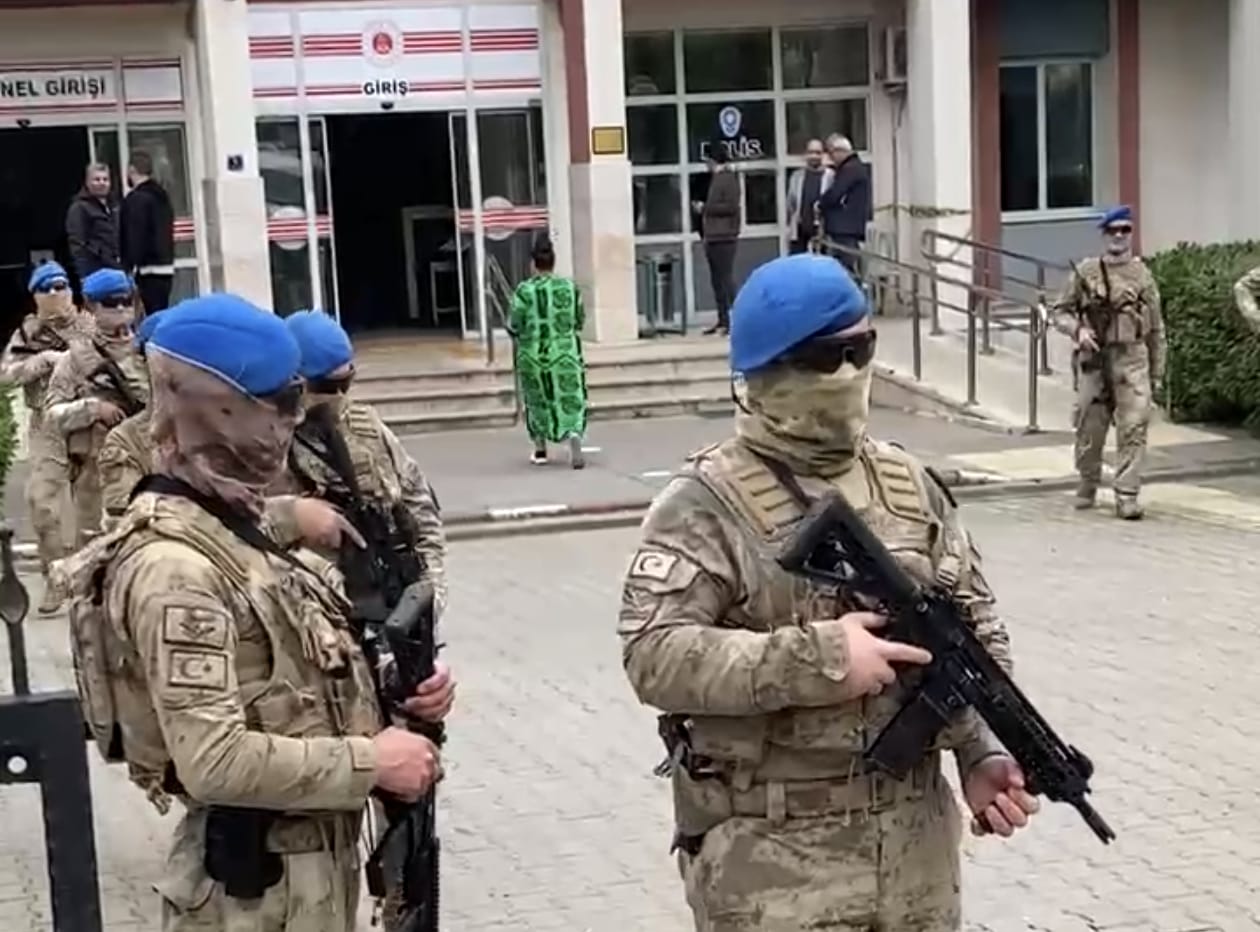 Otomatik Silahlı Nöbet: Komandoların otomatik silahlarla çevre güvenliğini sağladığı adliye girişinde, şüpheliler geniş bir güvenlik koridoru eşliğinde içeri alındı.