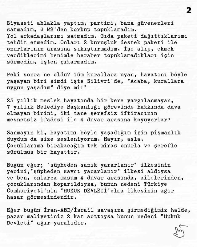 Görev süresi boyunca kamu kaynaklarını koruduğunu ve hukuk dışına çıkmadığını savunan Ömer Günel, tutuklanma sürecini “şahsına atılmış bir iftira” olarak niteledi. 25 yıllık meslek ve 7 yıllık başkanlık kariyerinde hiçbir adli vakaya karışmadığını belirten Günel, mektubunda şu ifadelere yer verdi: