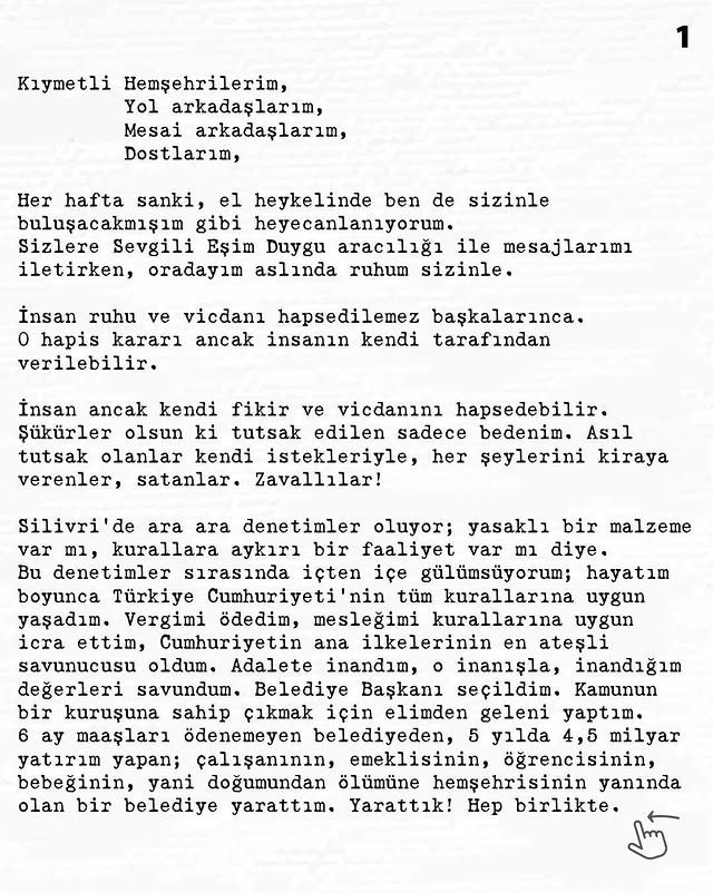 Silivri’deki günlük yaşamından ve cezaevi denetimlerinden de bahseden Günel, fiziksel olarak kısıtlansa da düşüncelerinin hapsedilemeyeceğini vurguladı. Destekçilerine ve Kuşadası halkına seslenen Günel, mektubunu şu çağrıyla noktaladı: