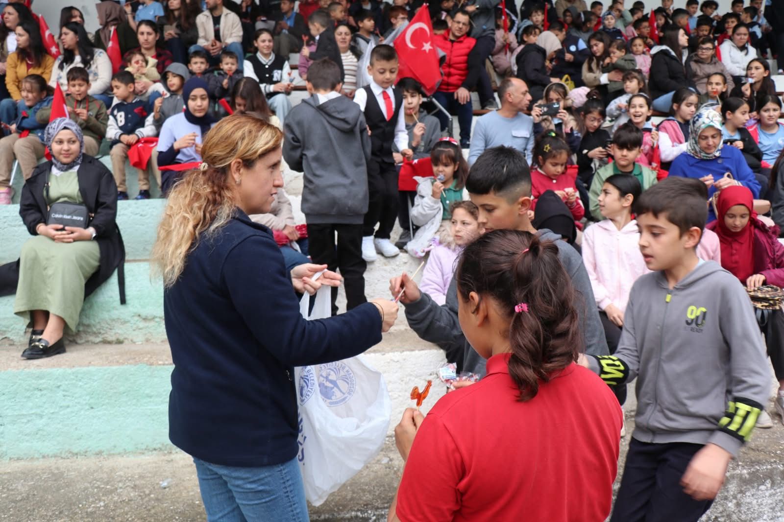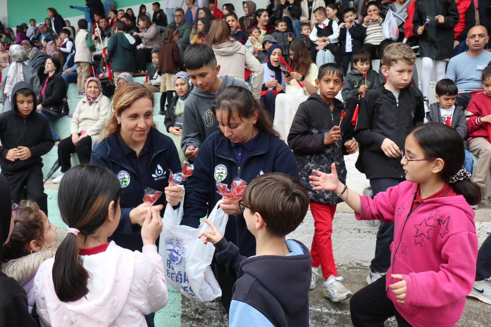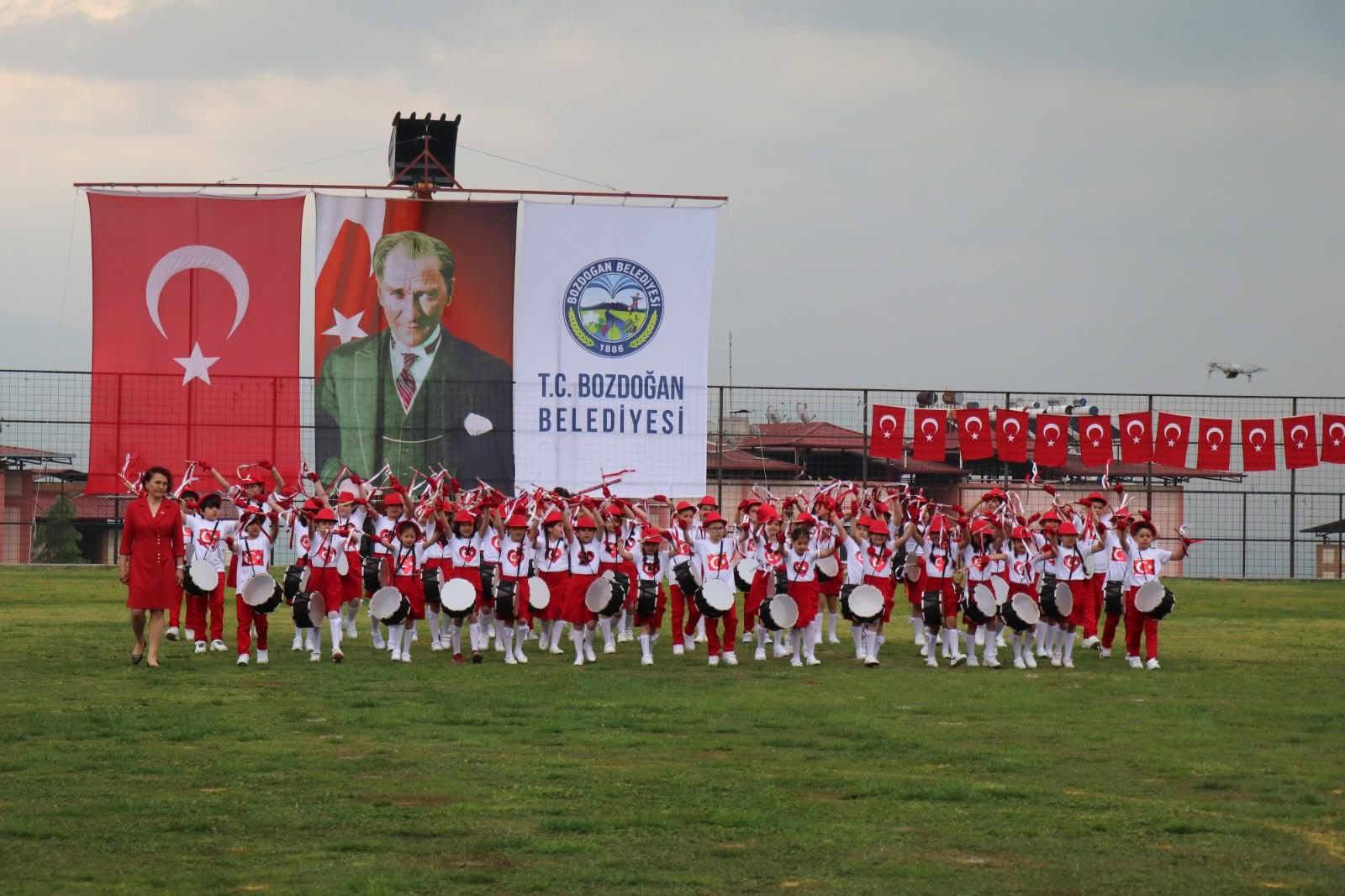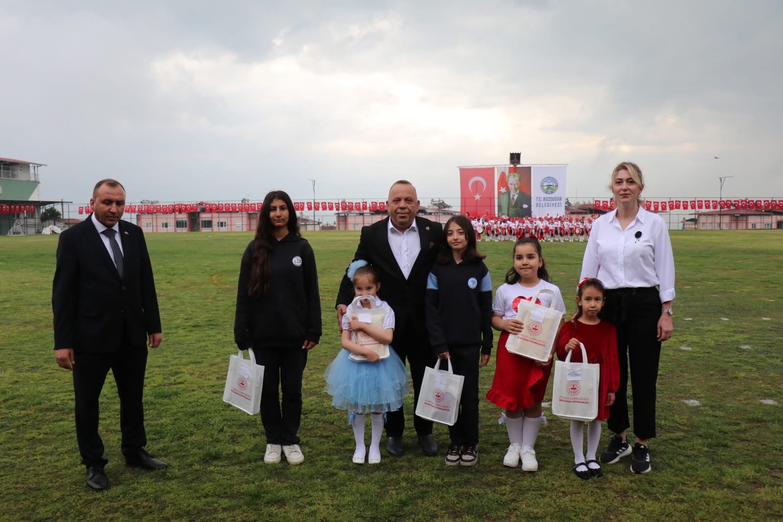 Aydın’ın Bozdoğan ilçesinde 23 Nisan Ulusal Egemenlik ve Çocuk Bayramı, olumsuz hava koşullarına rağmen büyük bir heyecanla kutlandı. Yağmura aldırış etmeyen ilçe halkı ve çocuklar, bayram coşkusunu stadyuma taşıdı.