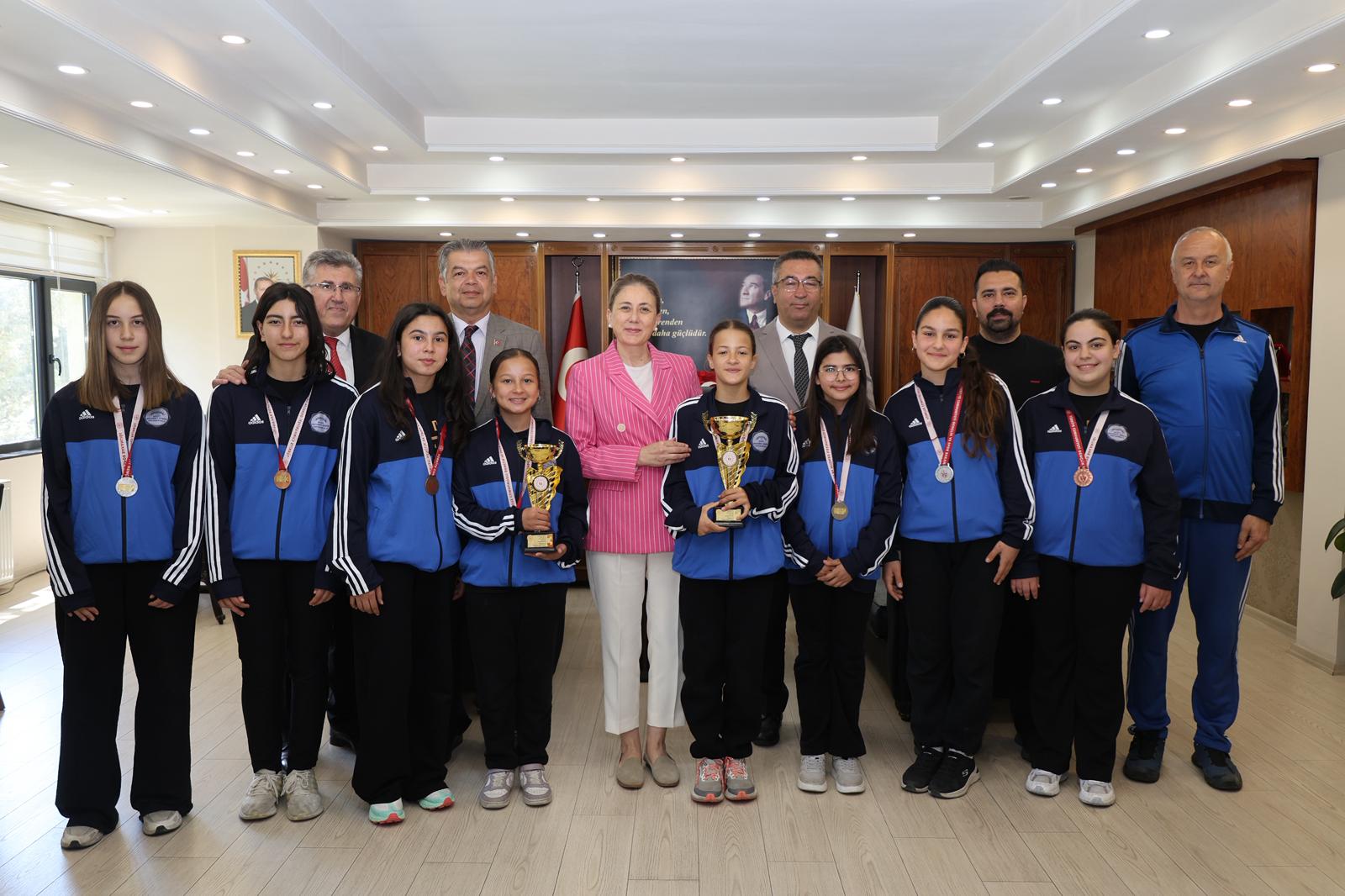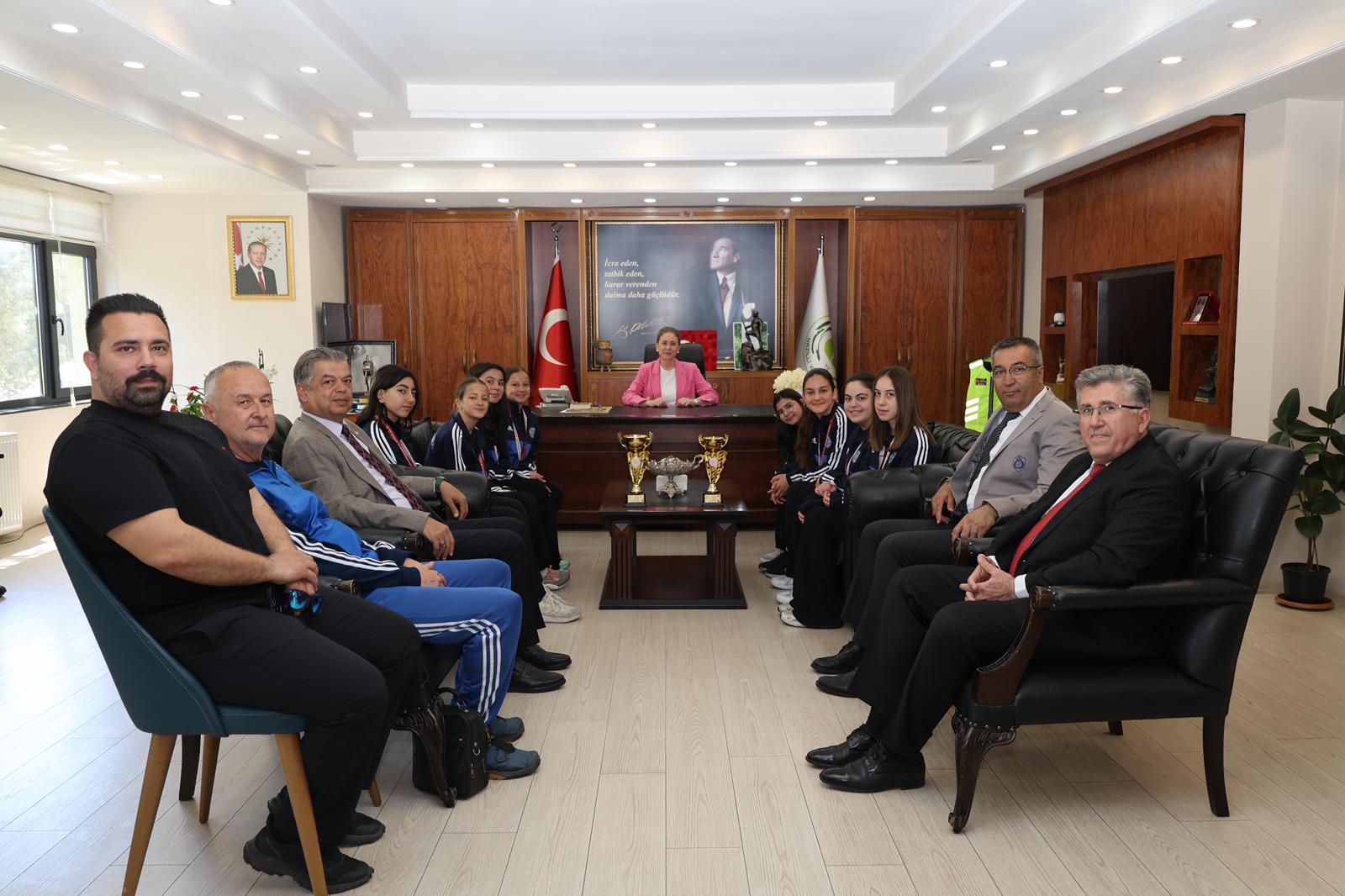 Kaymakamlık makamında gerçekleşen ziyarette şampiyon öğrencilere; İlçe Milli Eğitim Müdürü Erdinç Güner, Nazilli Gençlik ve Spor Müdürü Güven Eker ve Şehit Mehmet Dinek Ortaokulu Müdürü Osman Nalbantoğlu eşlik etti. Ziyaret sırasında öğrencilerin kazandığı kupalar ve madalyalar Kaymakam Kan’a takdim edildi.